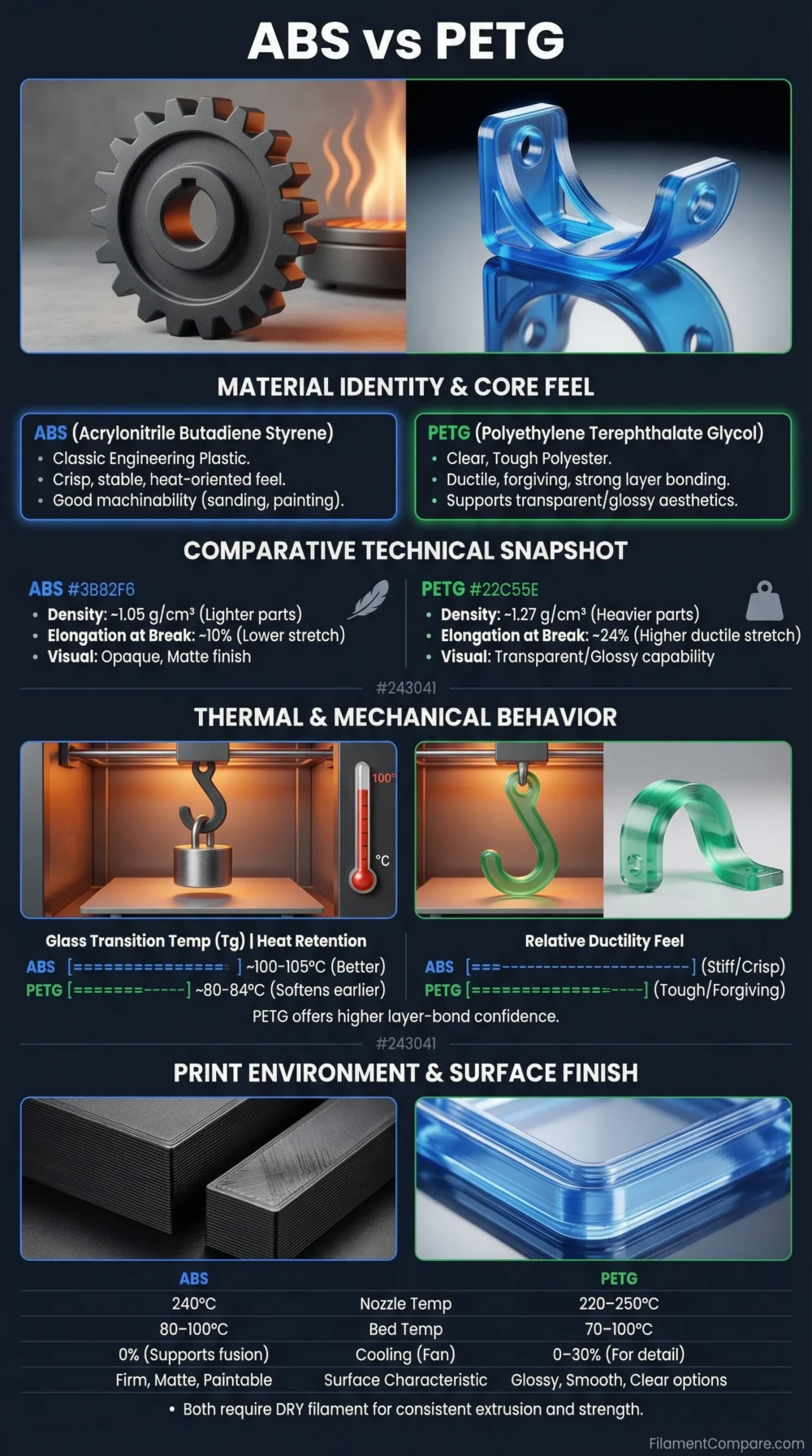 Reading note: The numbers above are real datasheet values for specific ABS and PETG filaments. Across the market, additives, colorants, and brand recipes can shift these figures.