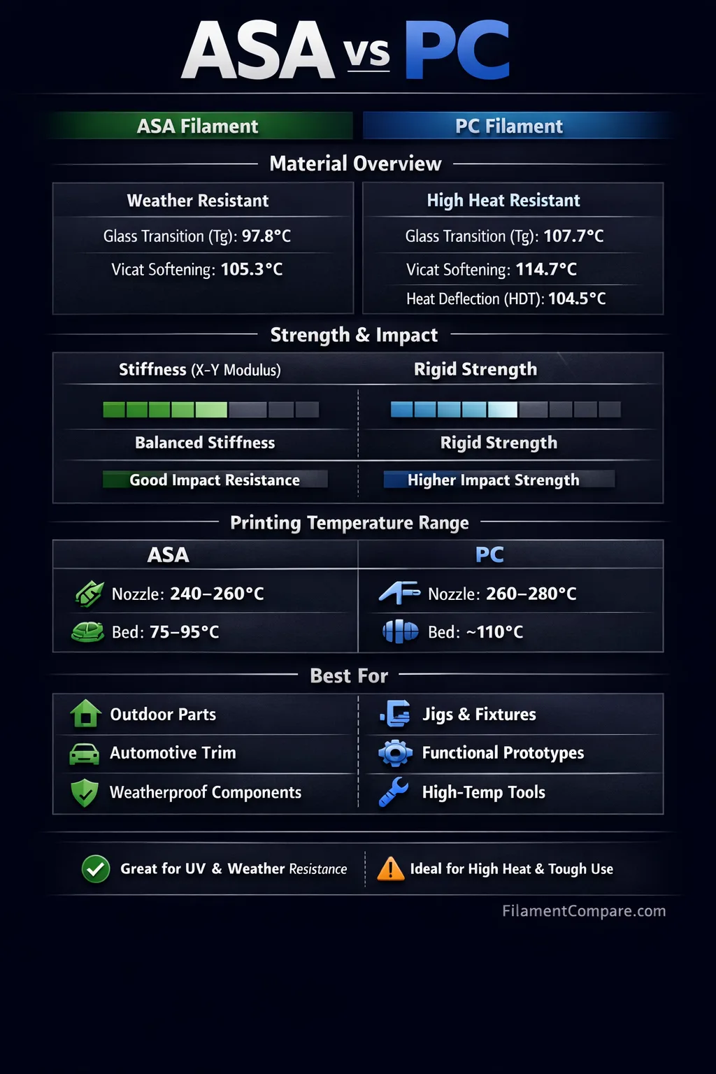 Picking between ASA and PC is mostly about environment and temperature. ASA filament is widely chosen when weather exposure matters, while PC filament is often selected for parts that need a confident, engineering-style feel under heat and impact. Both can produce clean, professional parts, and both benefit from being treated as engineering-grade 3D printing filaments rather than “basic plastics.”