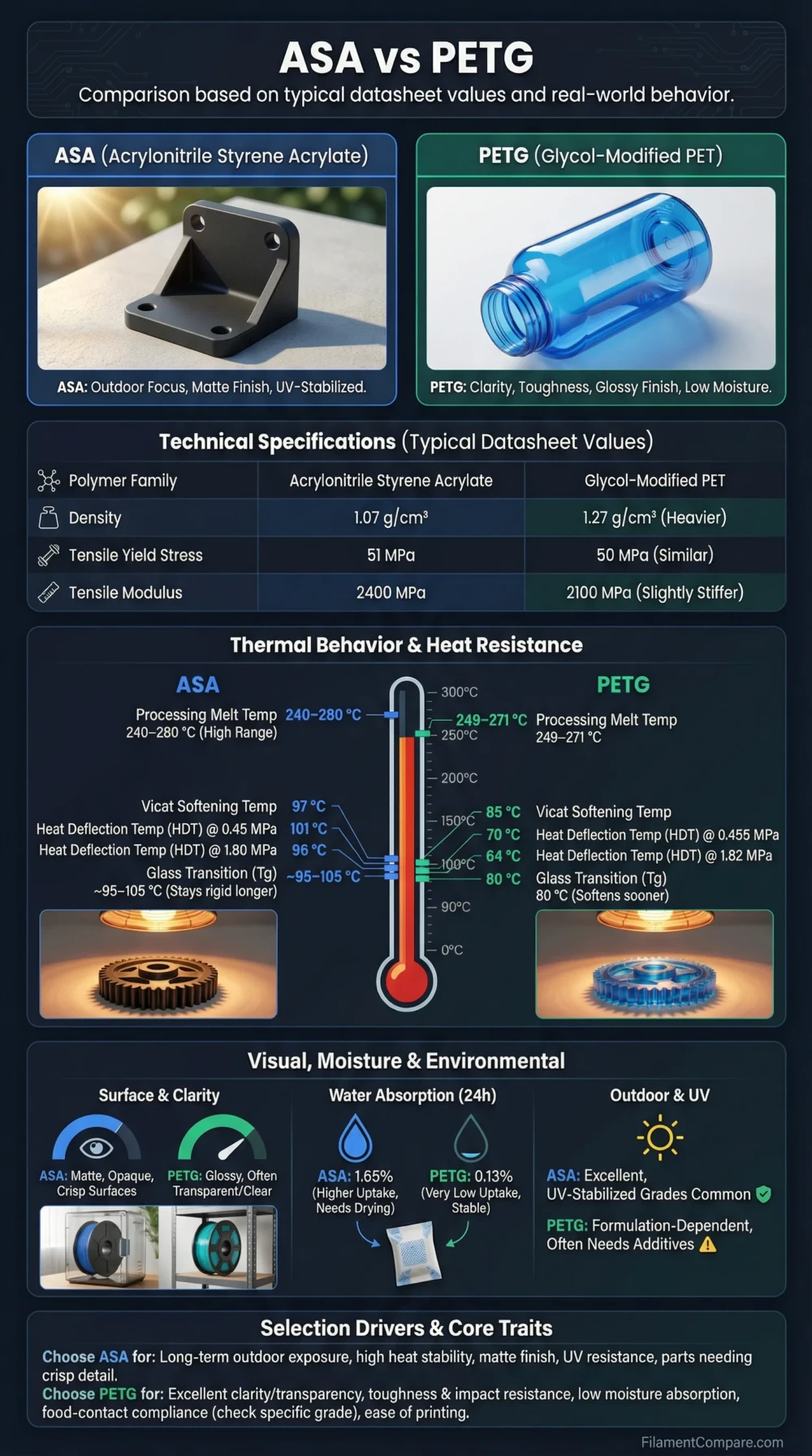 | Spec / Behavior | ASA (Typical Datasheet Values) | PETG (Typical Datasheet Values) |
