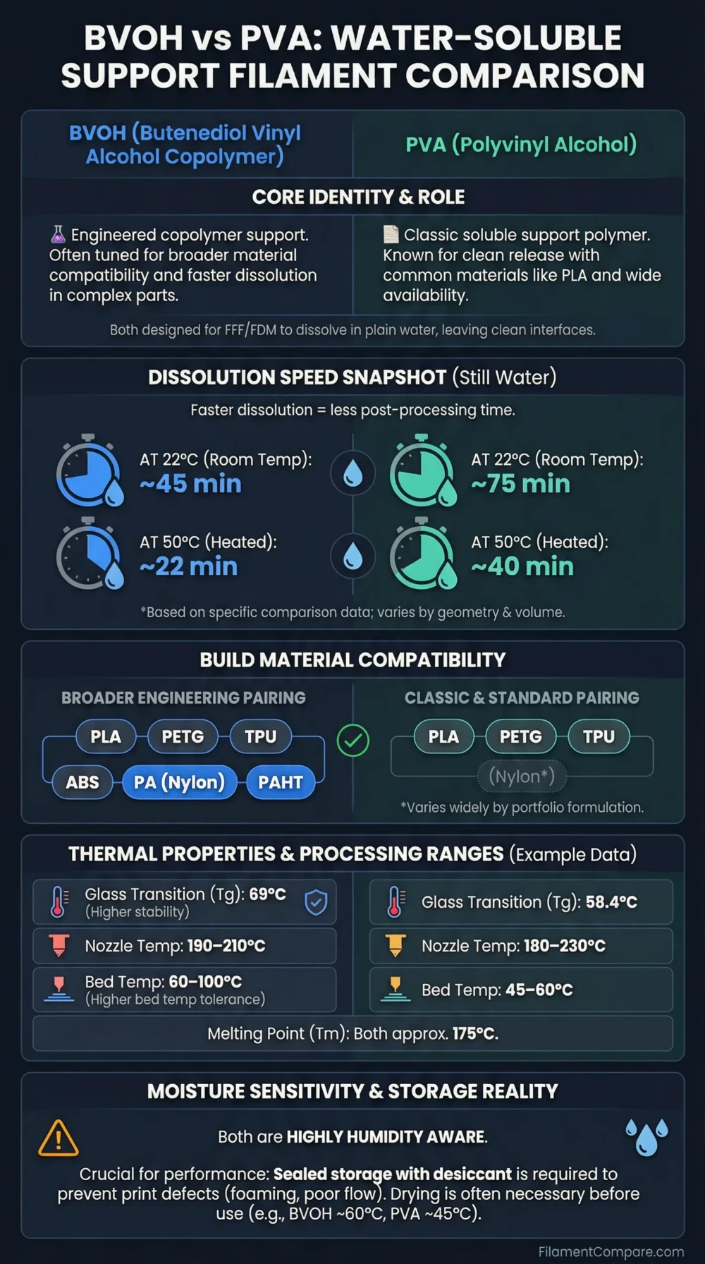 Dissolution time snapshots (22°C and 50°C) and the portfolio-style compatibility snapshot are based on a BCN3D comparison graphic for BVOH and PVA.✅Source