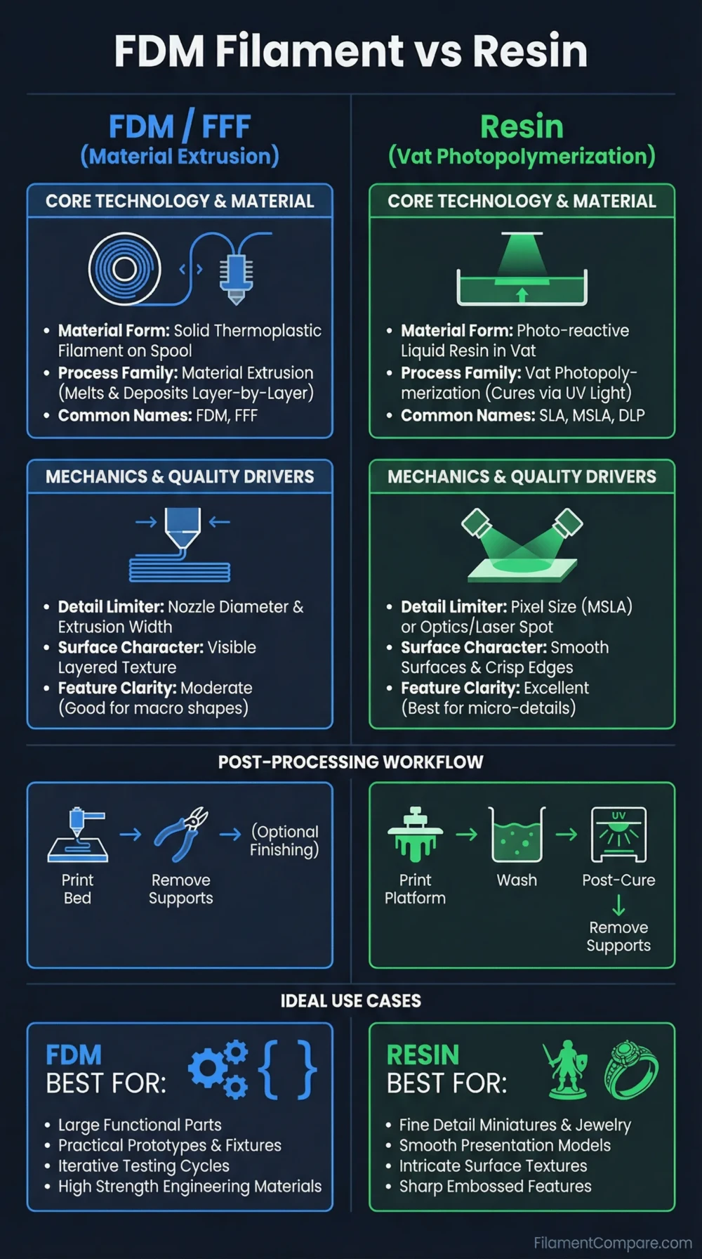 | Attribute | FDM Filament (Material Extrusion) | Resin (Vat Photopolymerization) |