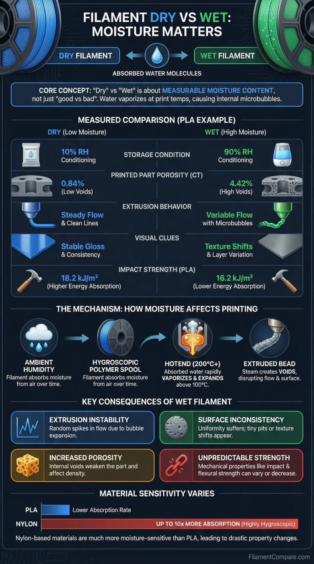 Dry vs wet is mainly about moisture level, not “good vs bad.” The table uses a controlled PLA humidity study as a numeric reference point, while the sections below cover the broader filament behavior across materials.
