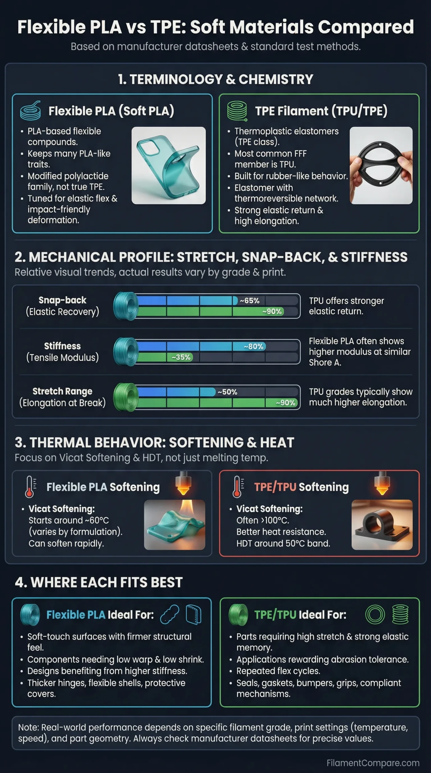 For Flexible PLA vs TPE, the figures below come from manufacturer datasheets plus recognized test-method references, so treat them as standardized trends—real prints can shift with machine, profile, and geometry.