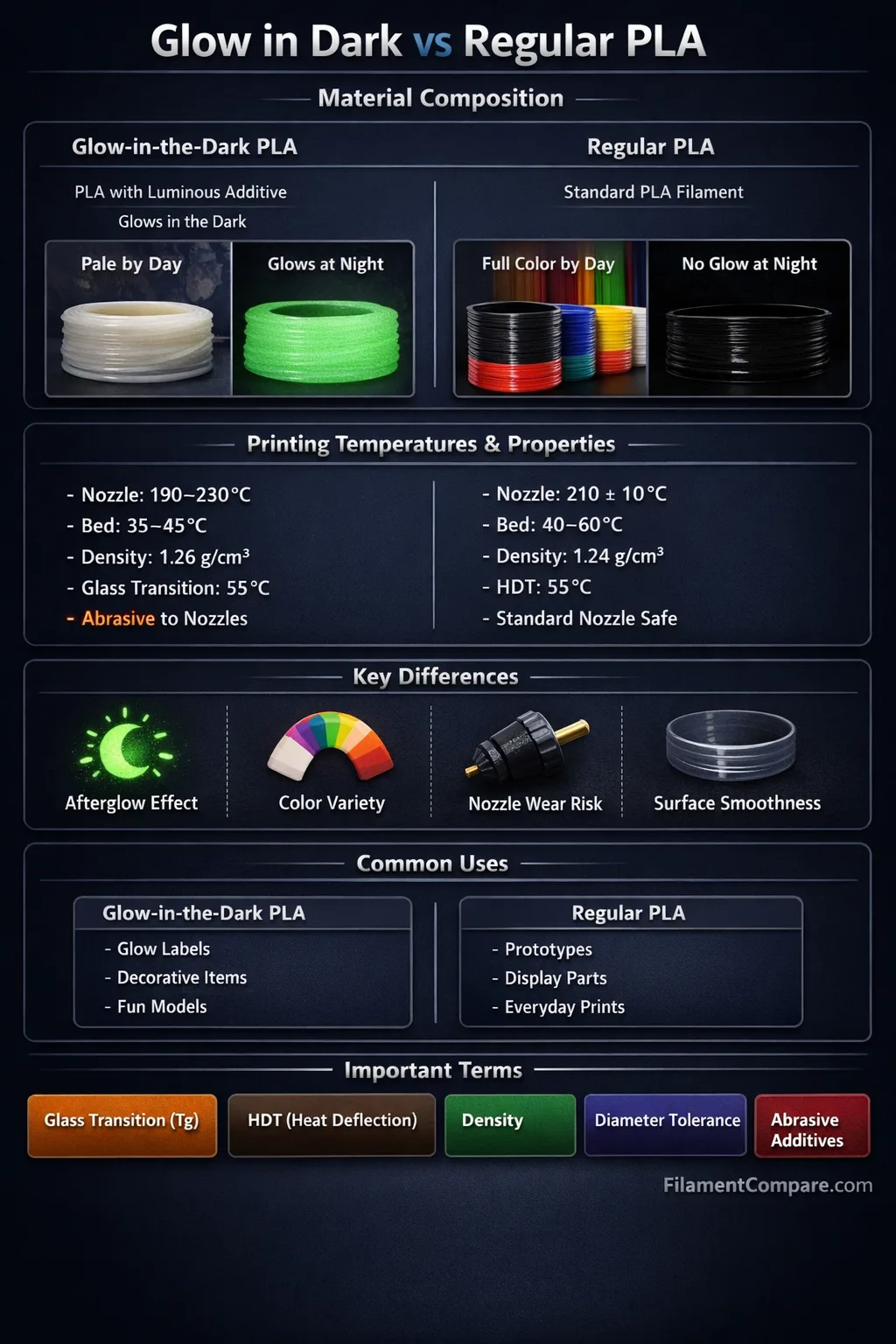 Glow-in-the-Dark PLA and Regular PLA share the same familiar PLA “personality,” yet they don’t behave identically. The big change is the luminous additive inside Glow PLA, which affects appearance, light behavior, and sometimes the “feel” of extrusion. If you’re comparing filaments for a filament knowledge or filament comparison site, these are the points that actually separate them in real use.