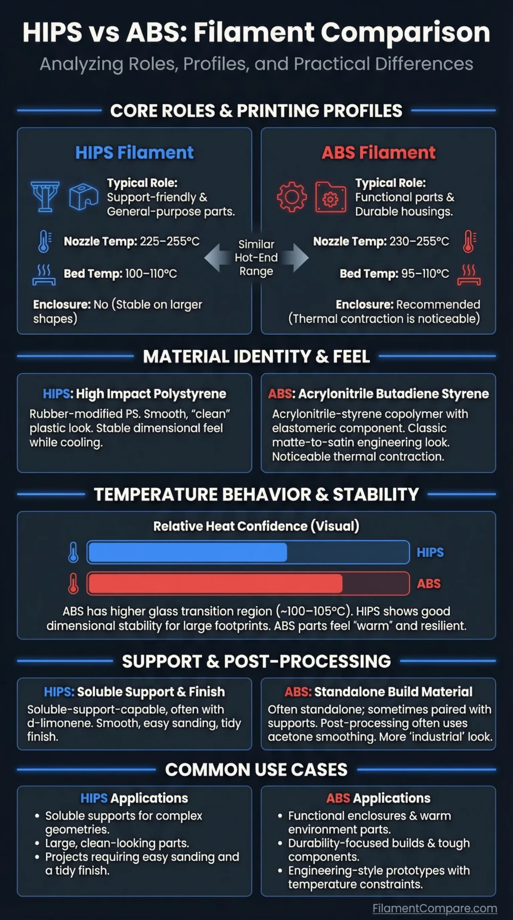 | Typical Role | Support-friendly and general-purpose parts | Functional parts and durable housings | Many users keep HIPS filament for supports, while ABS filament is often picked for parts that will see higher heat. |