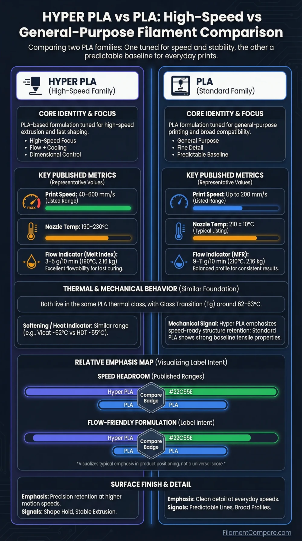 - Hyper PLA often stays inside the same PLA thermal class, while emphasizing flow and shape hold at speed.