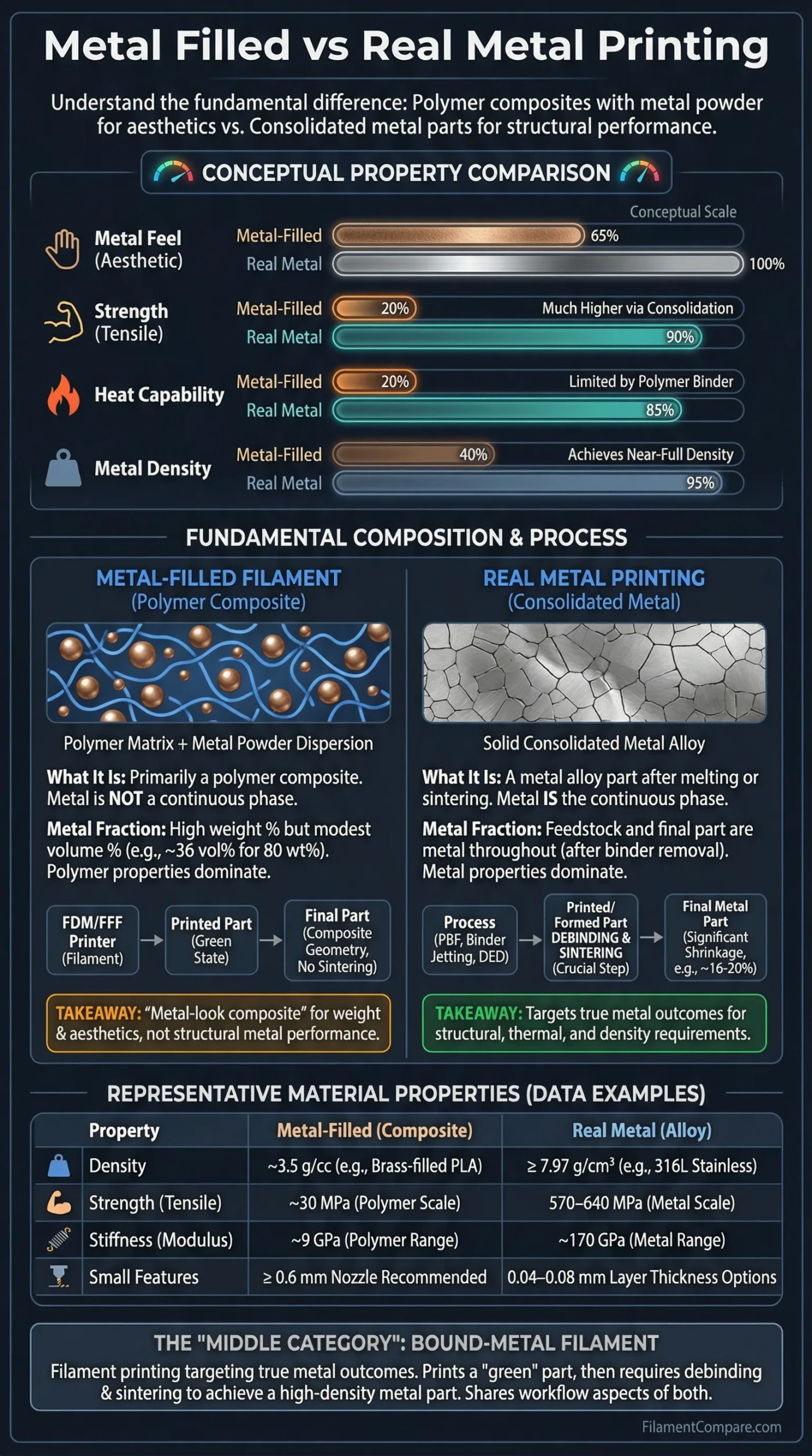 | Process Families You’ll See | Material extrusion (FDM/FFF) with a metal-powder-filled polymer matrix.[h] | Common “real metal” families include Powder Bed Fusion, Binder Jetting, and Directed Energy Deposition (plus sinter-based bound-metal extrusion).[c] |