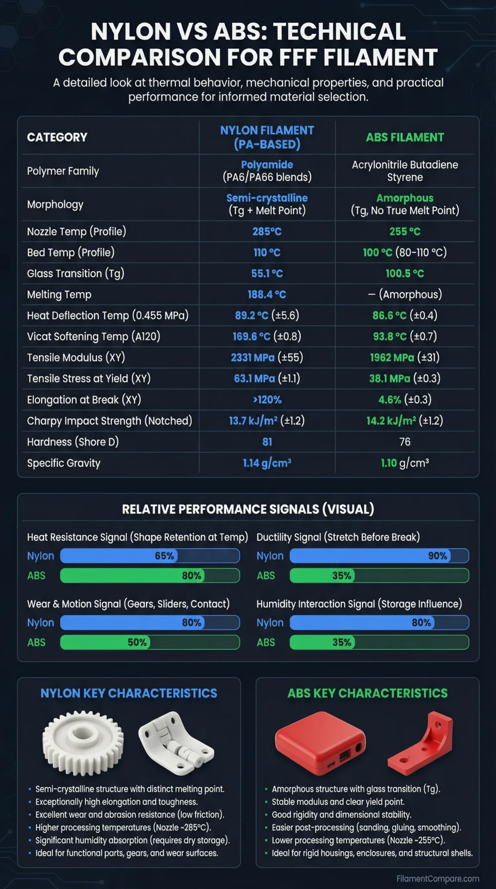 This comparison focuses on Nylon filament and ABS filament as FFF/FDM materials—two polymers often included in broader discussions of engineering-grade 3D printing filaments. You’ll see thermal behavior, mechanical properties, and the practical meaning of the numbers—so picking Nylon or ABS feels like a clear technical decision, not guesswork.