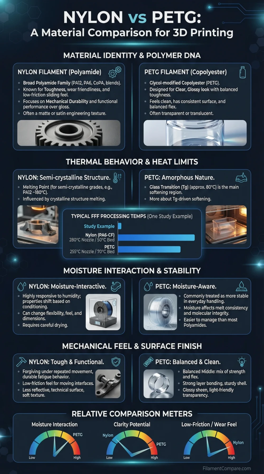 Nylon is widely treated as humidity-responsive: the same spool can behave slightly differently when it’s very dry versus when it’s conditioned by ambient air. PETG is also moisture-aware (copolyesters can be sensitive during melt processing), but it’s often described as more steady in everyday printing workflows.