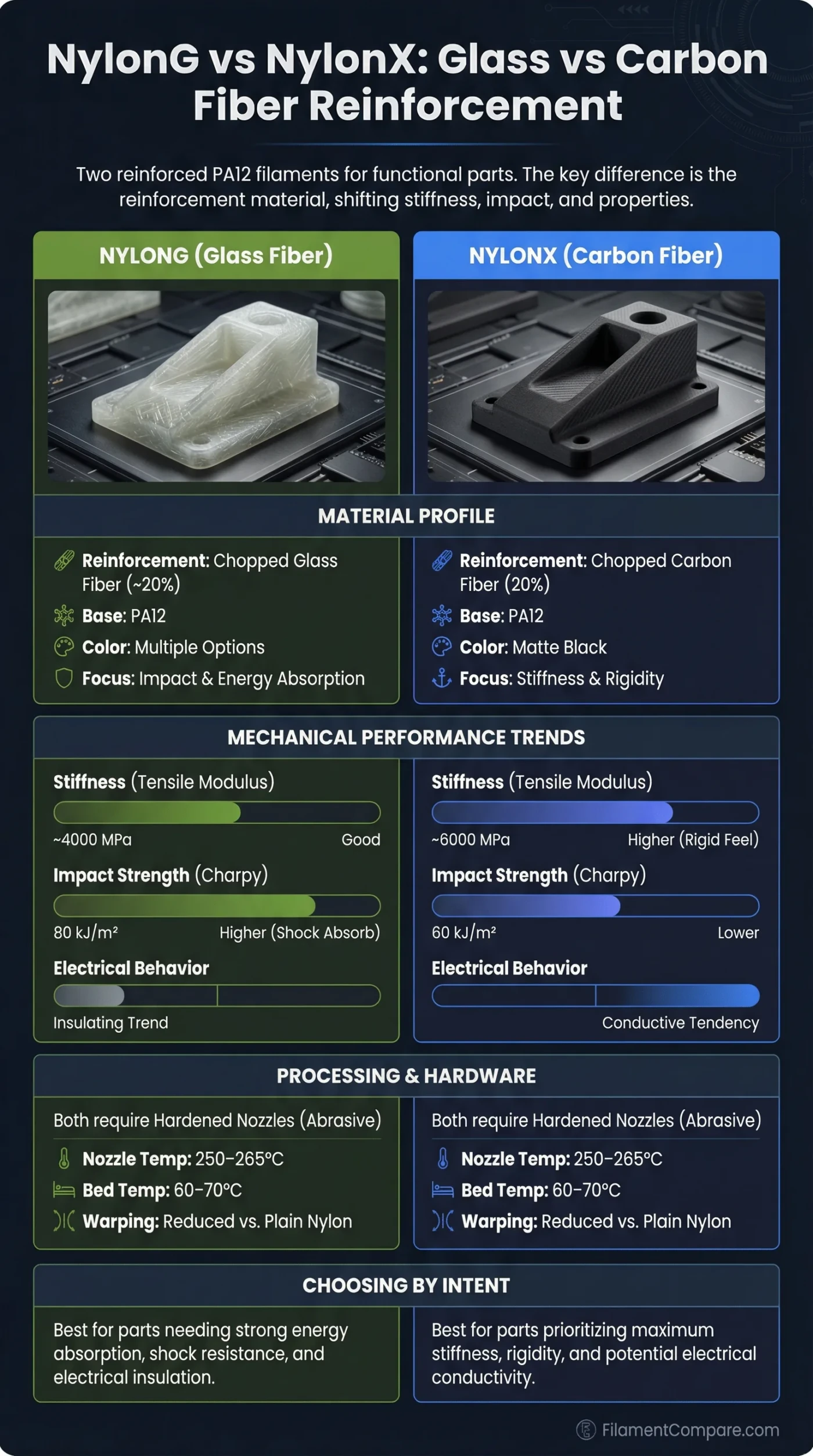 NylonG and NylonX are both reinforced PA12 filaments designed for functional parts where “plain nylon” may feel too flexible or too warp-prone. The big difference is the reinforcement: glass fiber in NylonG versus carbon fiber in NylonX. That single choice shifts stiffness, impact behavior, electrical properties, and even how your nozzle wears over time.