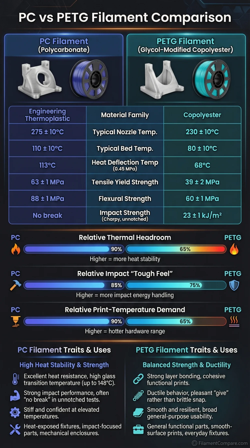For functional parts, it helps to separate instant strength from long-term shape holding. The HDT difference shown in the table is a strong clue: PC-based filaments typically hold geometry at higher temperatures under load than PETG-based filaments. Materials with this type of performance are often grouped among engineering-grade 3D printing filaments, where thermal stability and structural reliability are key design factors.