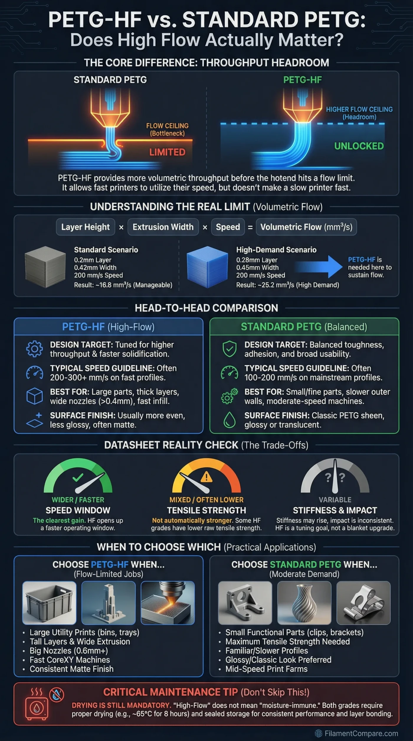 This comparison blends PETG-HF and standard PETG data from Bambu Lab and eSUN, then checks the flow-limiting side against Prusa and E3D references; it shows the direction these grades are built to move, while real parts still shift with nozzle size, hotend capacity, slicer settings, and model geometry.