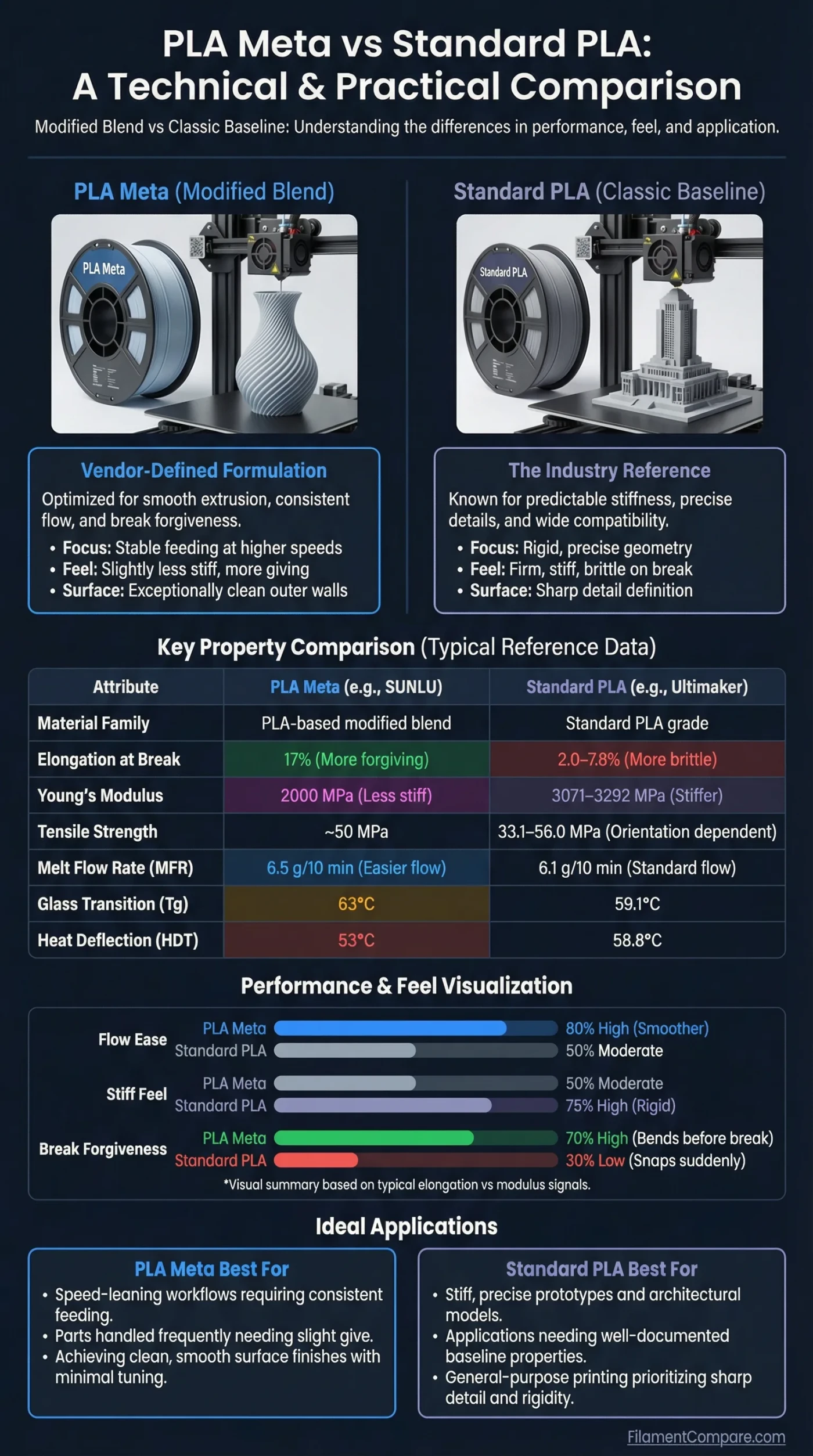 PLA Meta and PLA share the same core polymer family, but they behave a bit differently in real printing. Think of PLA Meta as a vendor-defined modified PLA that’s commonly tuned for smoother extrusion and steadier feeding, while PLA is the classic baseline people use as a reference point. For a broader overview of PLA formulations and how variants like PLA+, HT-PLA, and Meta PLA fit into the wider PLA ecosystem, see the Ultimate PLA Filament Guide.