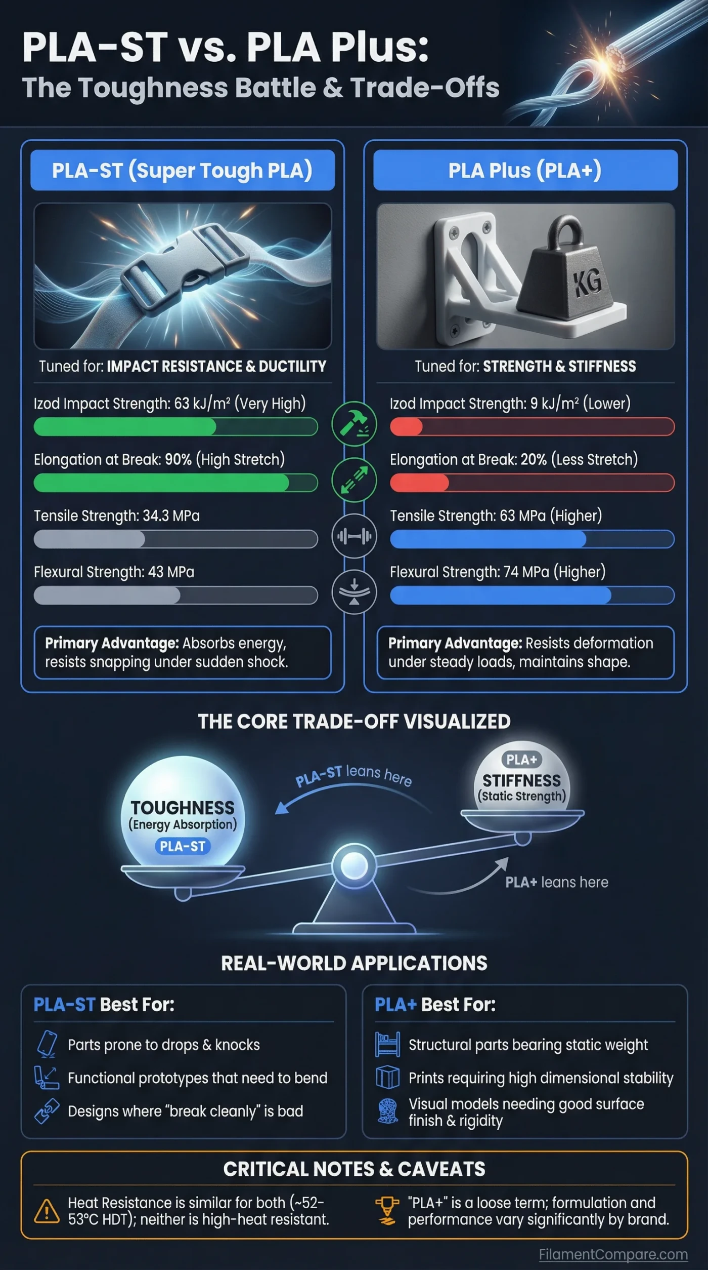 This PLA-ST vs PLA Plus comparison leans on manufacturer datasheets and standard-test references to show typical performance trends, and real printed-part results can vary with printer, geometry, and settings.