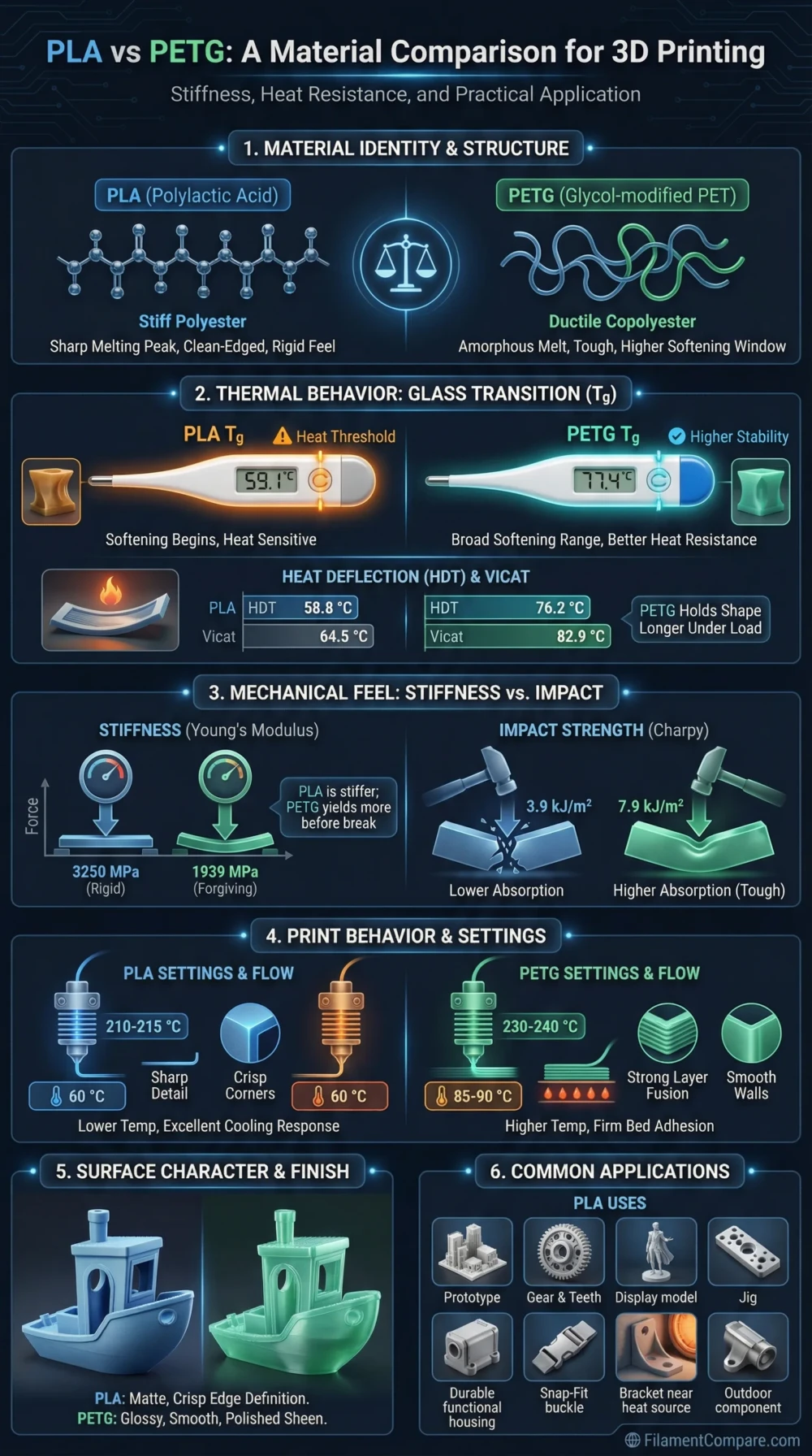 About These Numbers PLA and PETG figures above come from standardized tests on 3D-printed specimens, so they feel closer to real parts than raw-pellet data. The exact outcome still shifts with infill, layer height, and orientation.