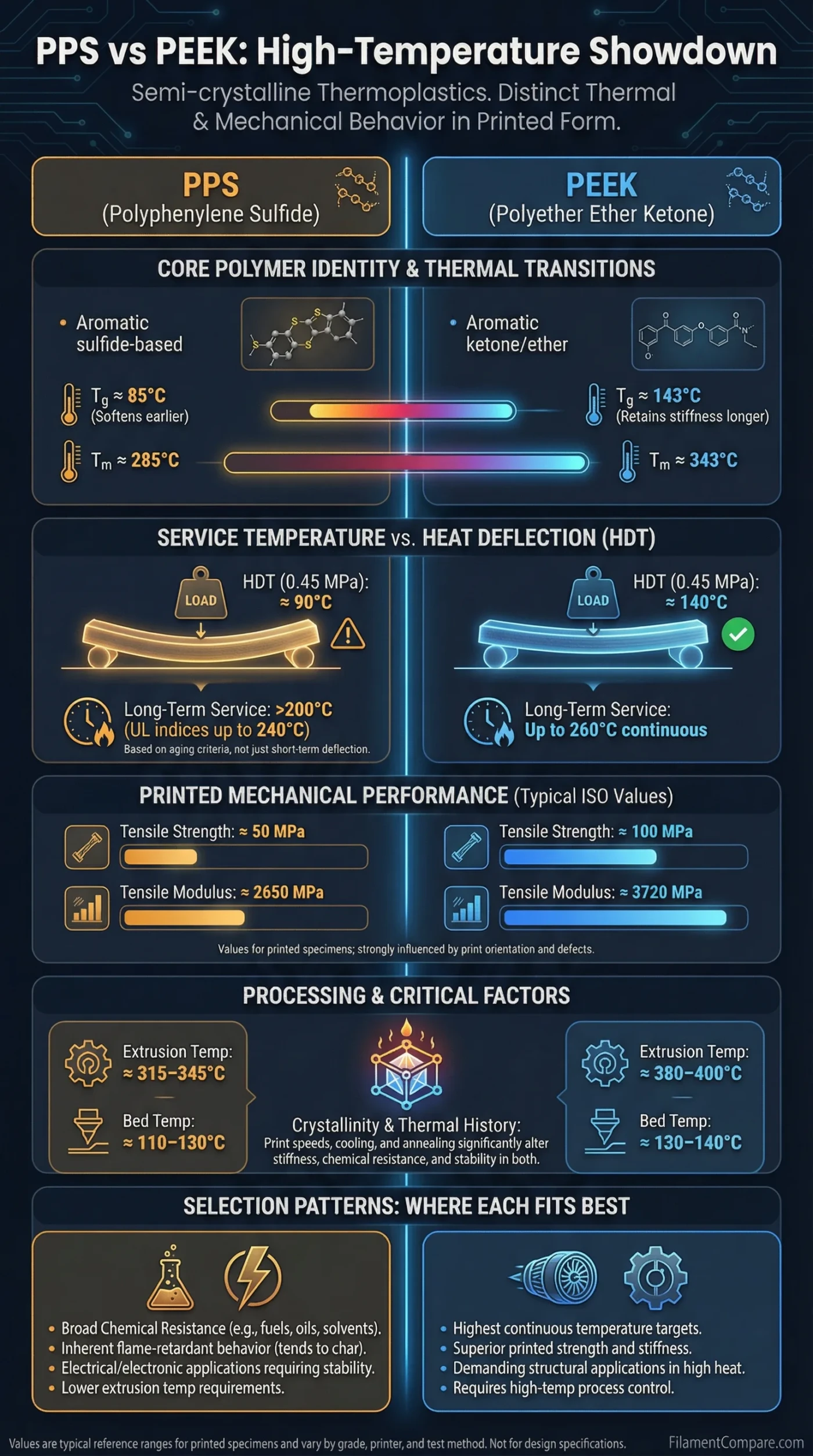A good comparison keeps two ideas in the same frame: the base polymer identity (PPS vs PEEK) and the filament-grade reality (what a given datasheet measured on printed specimens). The numbers in the table above are from printed ISO specimens on filament datasheets, which helps you compare like-for-like within that context.