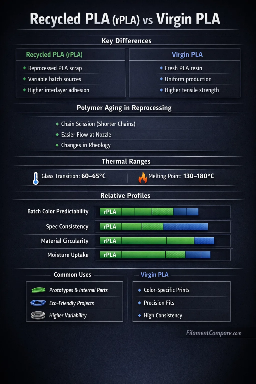 | Spec / Topic | Recycled PLA (rPLA) ✅Source | Virgin PLA ✅Source |