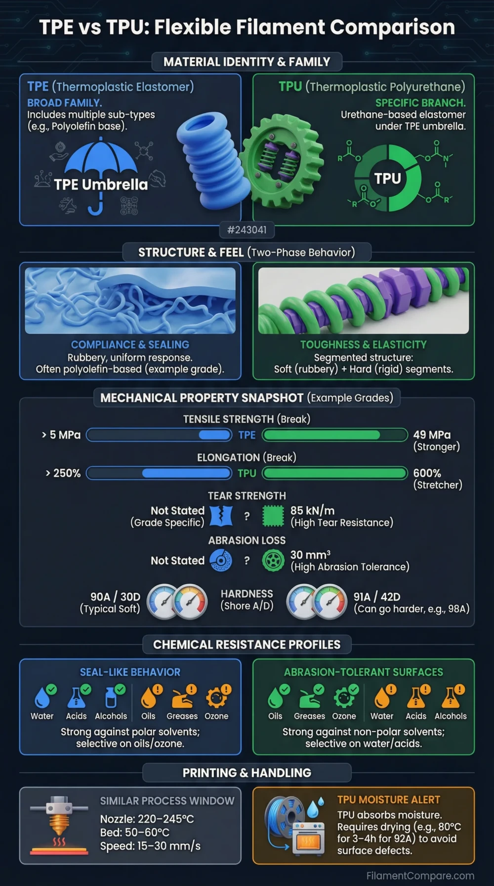 | Comparison Point | TPE Filament (Example Grade) | TPU Filament (Example Grade) |