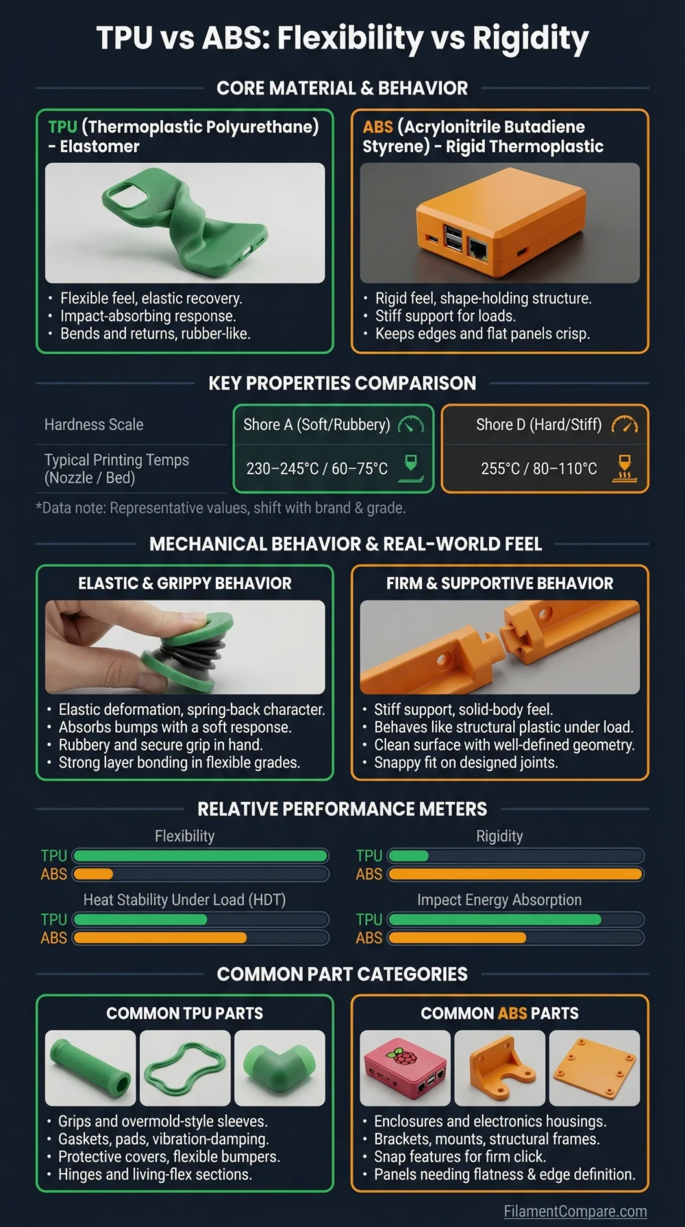 TPU is a thermoplastic elastomer family, commonly grouped with other flexible filament types, so it can bend, compress, and spring back with a very rubber-like response. ABS is a rigid thermoplastic, so it tends to hold angles, edges, and flat panels with a more structural feel.