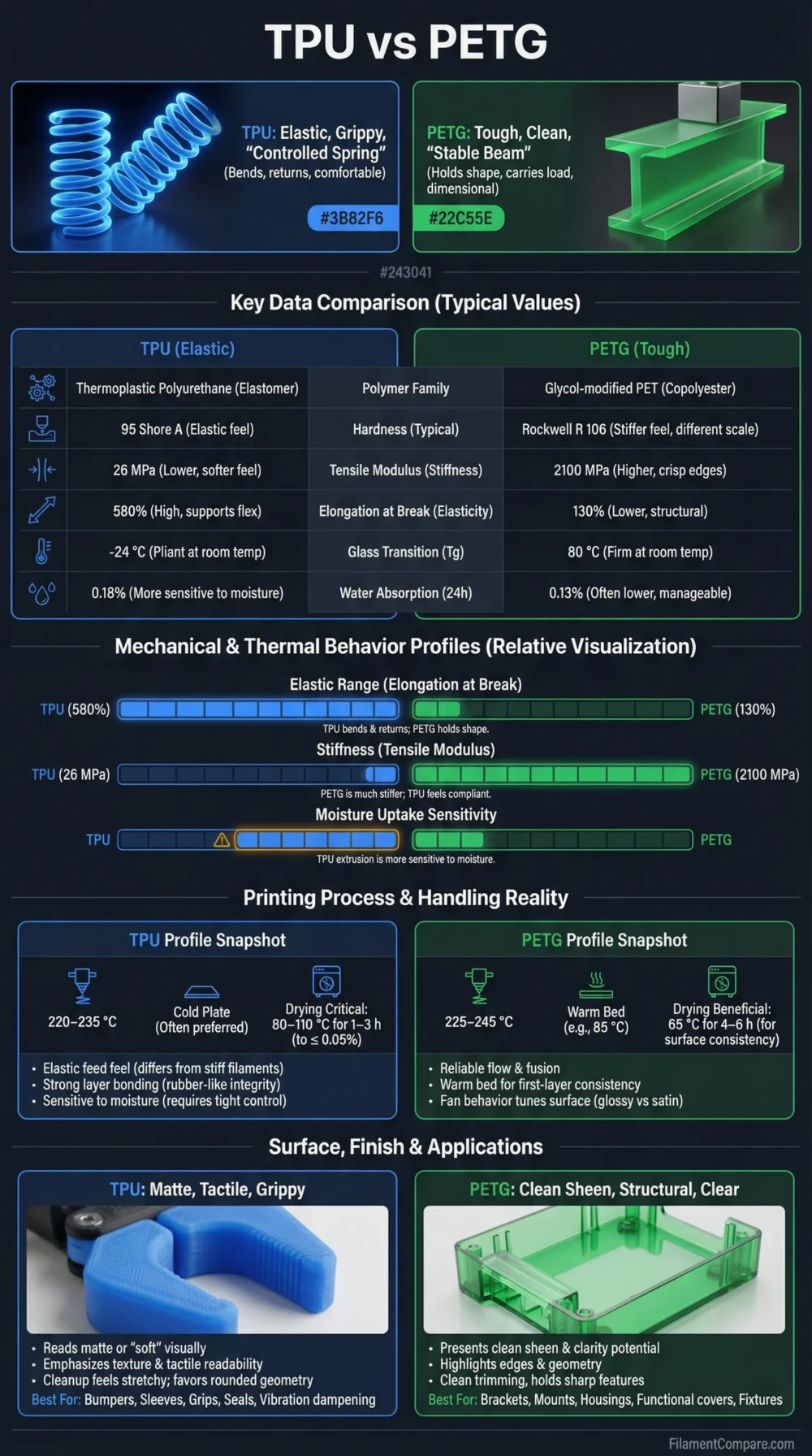 PETG also benefits from dry handling in many workflows, especially when surface consistency matters. Its published water absorption values are often lower than soft elastomers, and it tends to feel more dimension-consistent when kept in a stable environment.