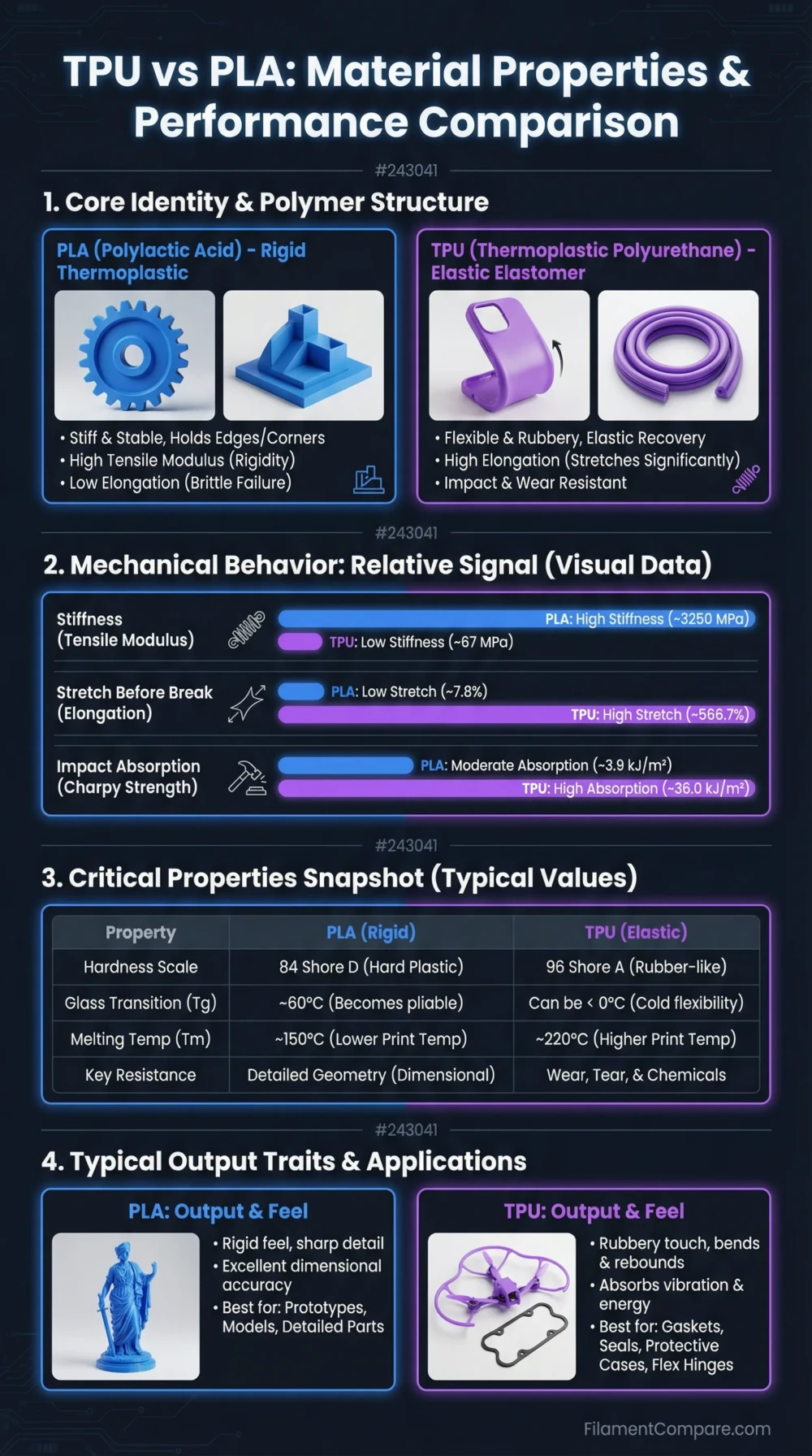 - Tensile modulus tracks how “springy stiff” the part feels under small strain. PLA commonly reads higher than TPU in printed datasheets.