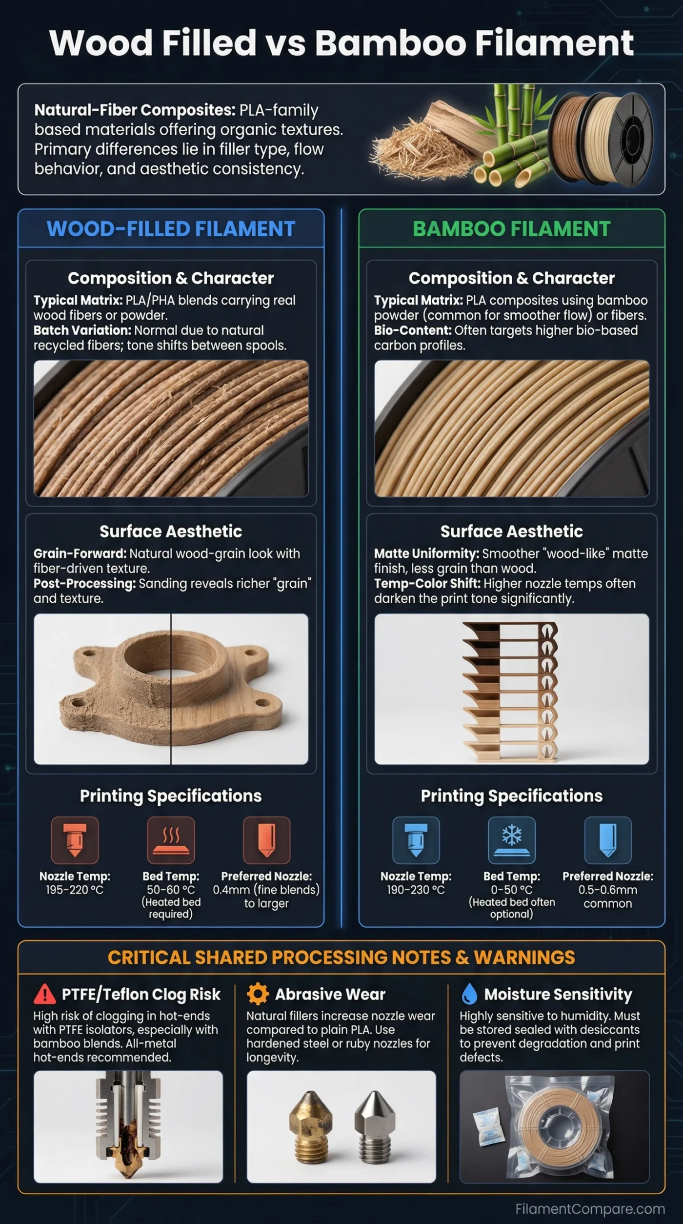 This wood-filled filament vs bamboo filament comparison is grounded in manufacturer datasheets and reputable technical references, so treat the figures as typical benchmarks—real prints can vary by machine, settings, and batch.